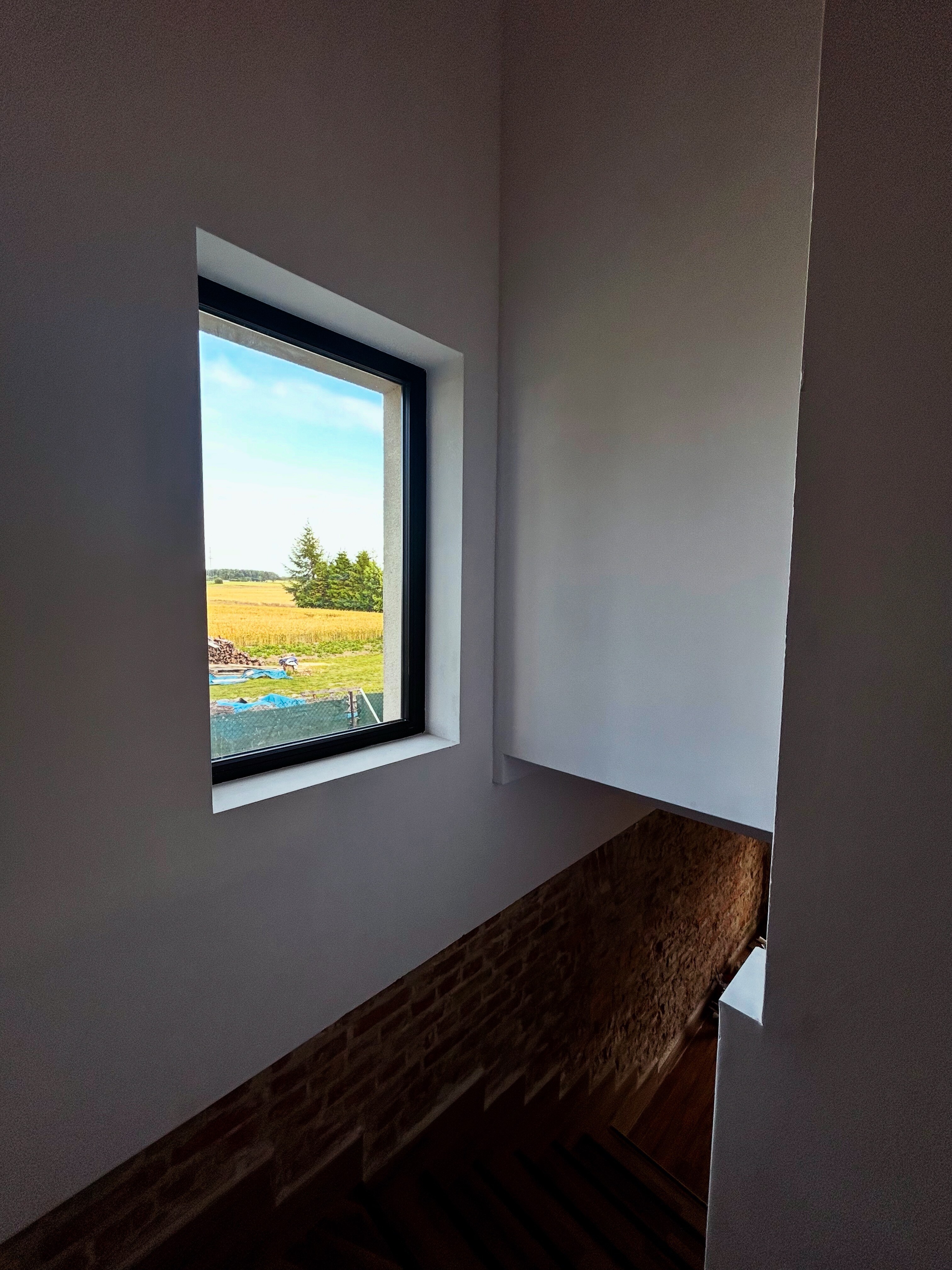 Wielkie okna sięgające ziemi otwierają stodołę na ogród i krajobraz siedliska, wpuszczając do środka światło, zieleń i spokój.