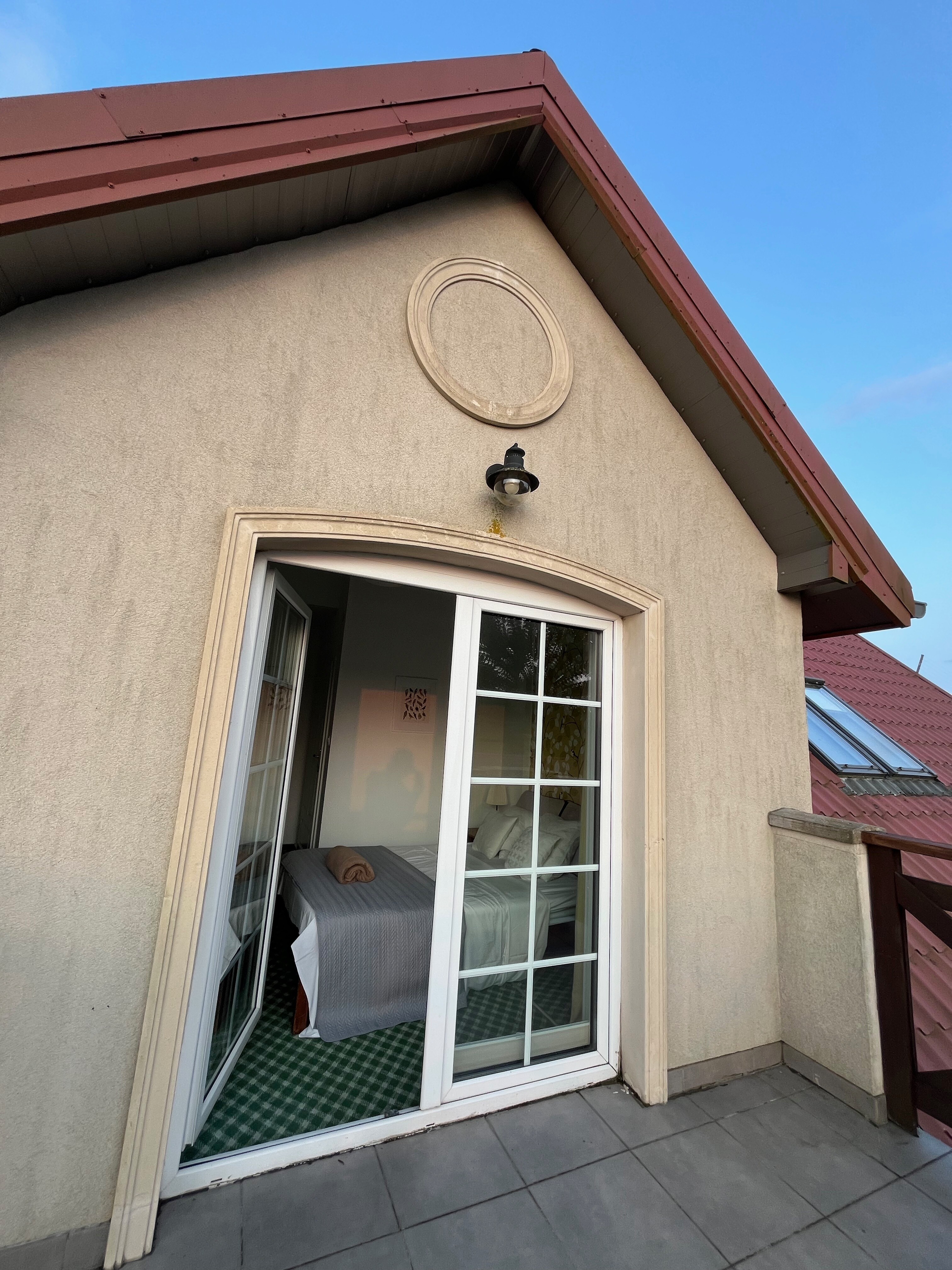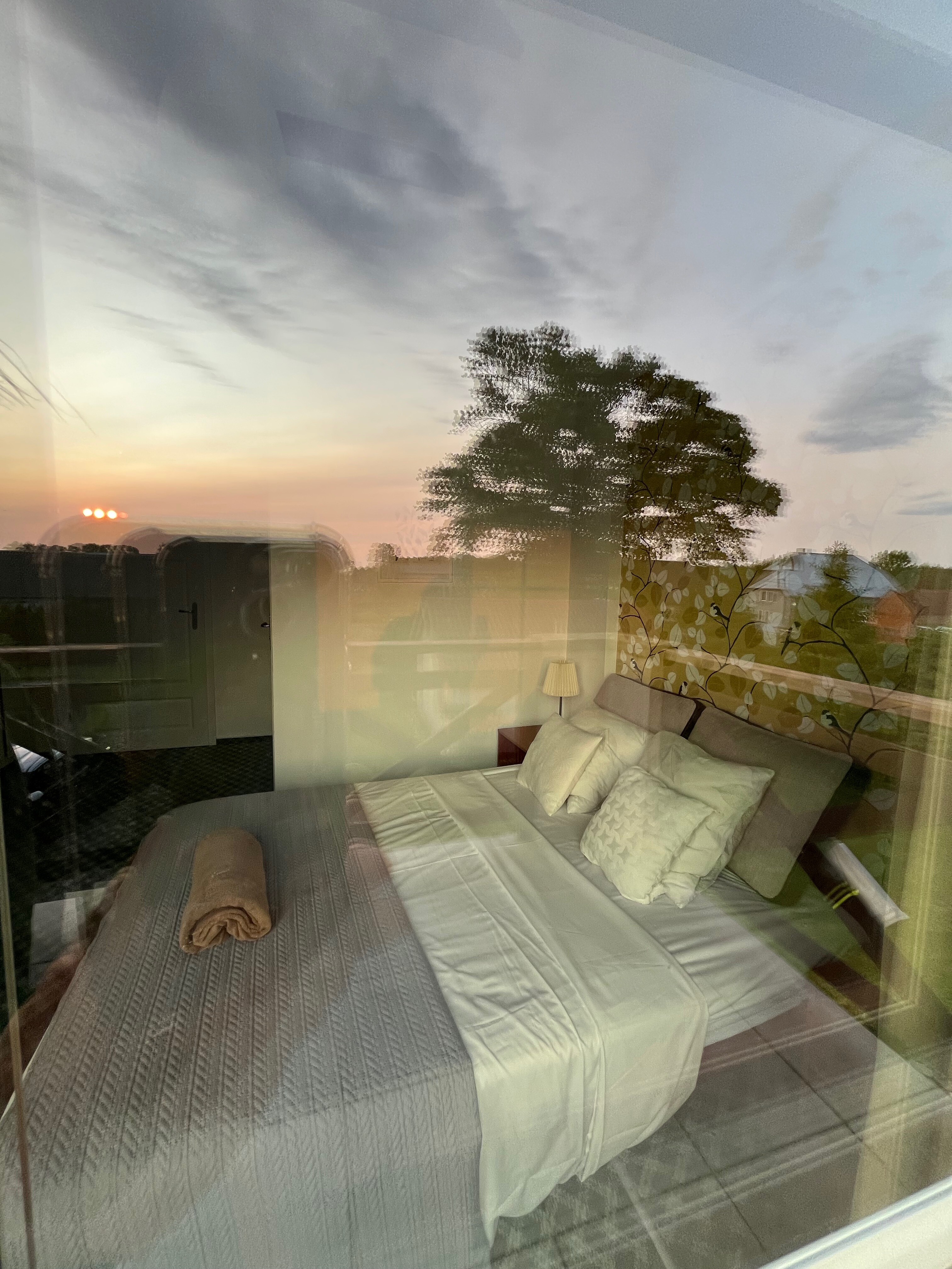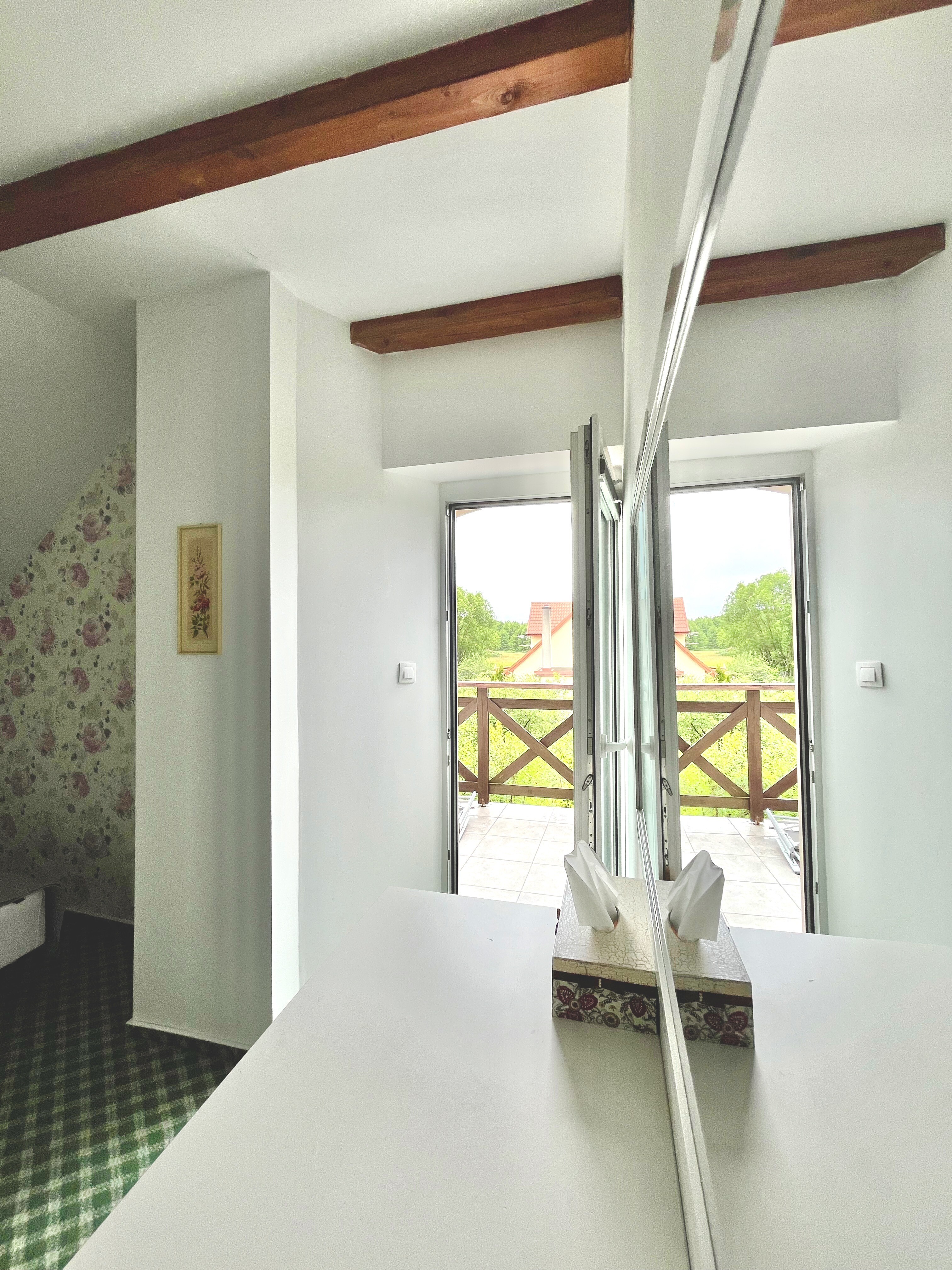 Przestronny pokój dla dwojga, z prywatną łazienką i dużym tarasem skąpanym w słońcu. Leżaki, stolik i widok na bujny ogród oraz malowniczą kaszubską wieś tworzą idealną scenerię dla długich wieczorów i zachodów słońca, które zapierają dech. Tuż obok, na tym samym piętrze – przytulna przestrzeń wspólna z aneksem kuchennym, kanapami i telewizorem – sprzyja chwilom spokoju i spotkaniom.