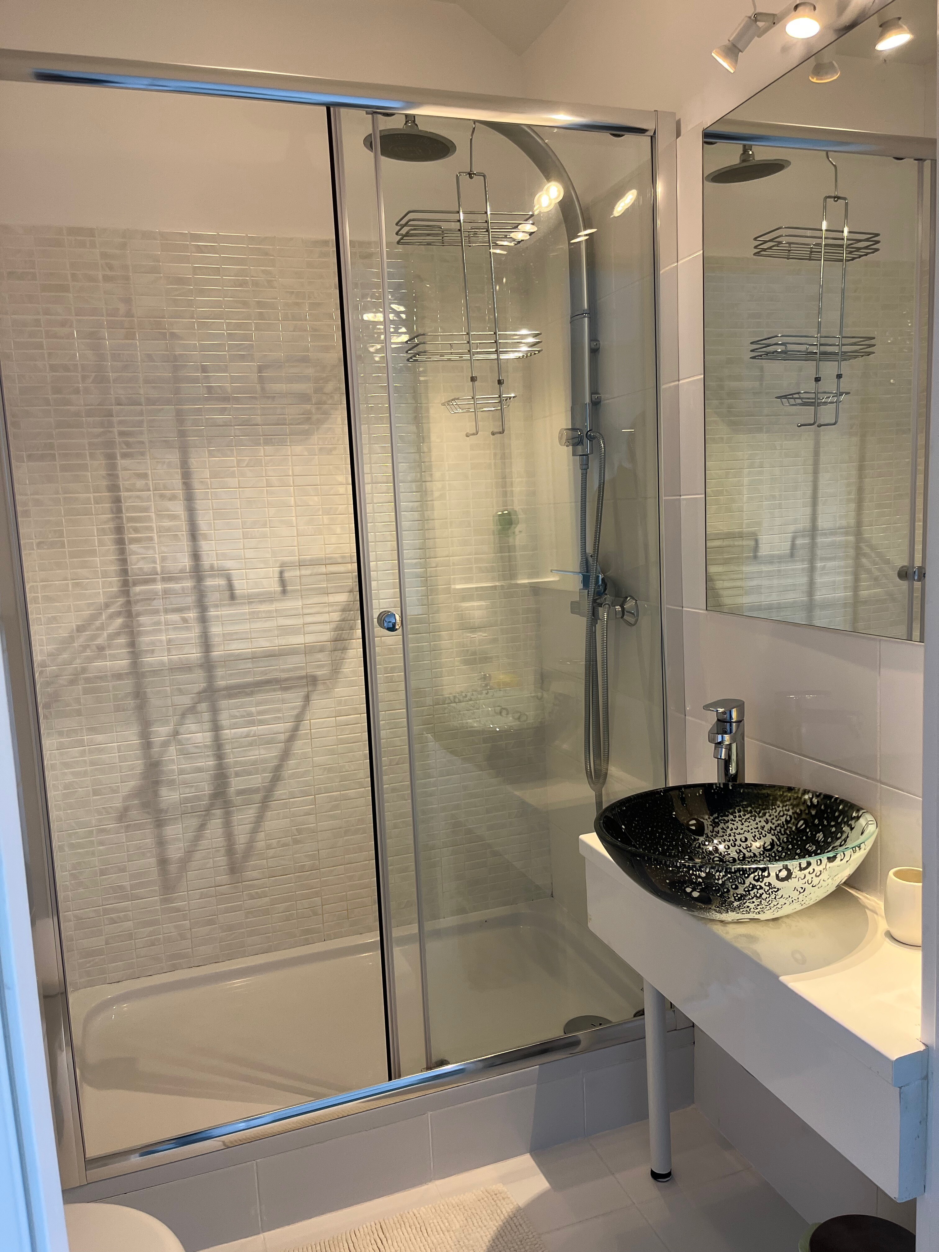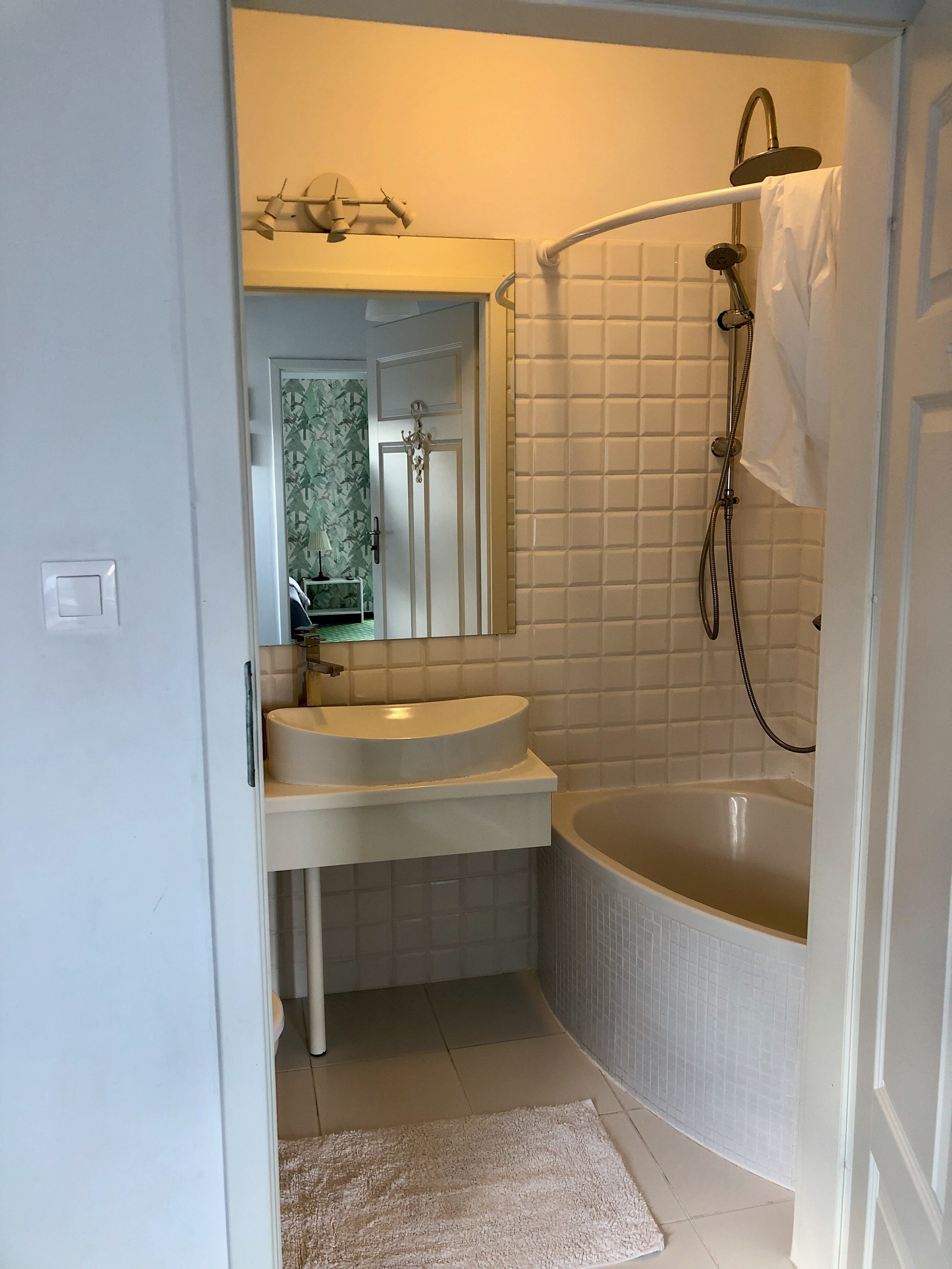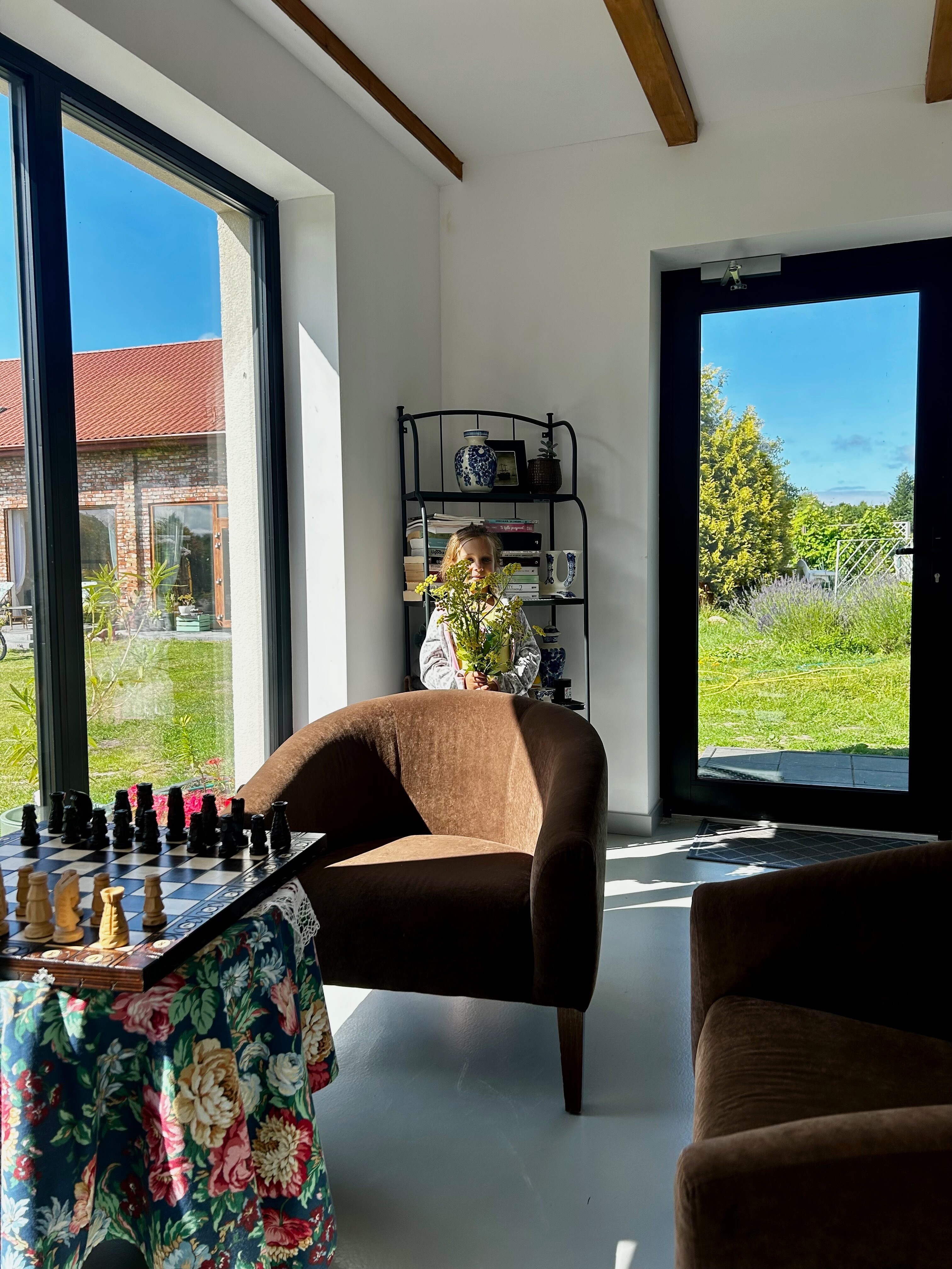 Przestronny pokój dla dwojga, z prywatną łazienką i dużym tarasem skąpanym w słońcu. Leżaki, stolik i widok na bujny ogród oraz malowniczą kaszubską wieś tworzą idealną scenerię dla długich wieczorów i zachodów słońca, które zapierają dech. Tuż obok, na tym samym piętrze – przytulna przestrzeń wspólna z aneksem kuchennym, kanapami i telewizorem – sprzyja chwilom spokoju i spotkaniom.