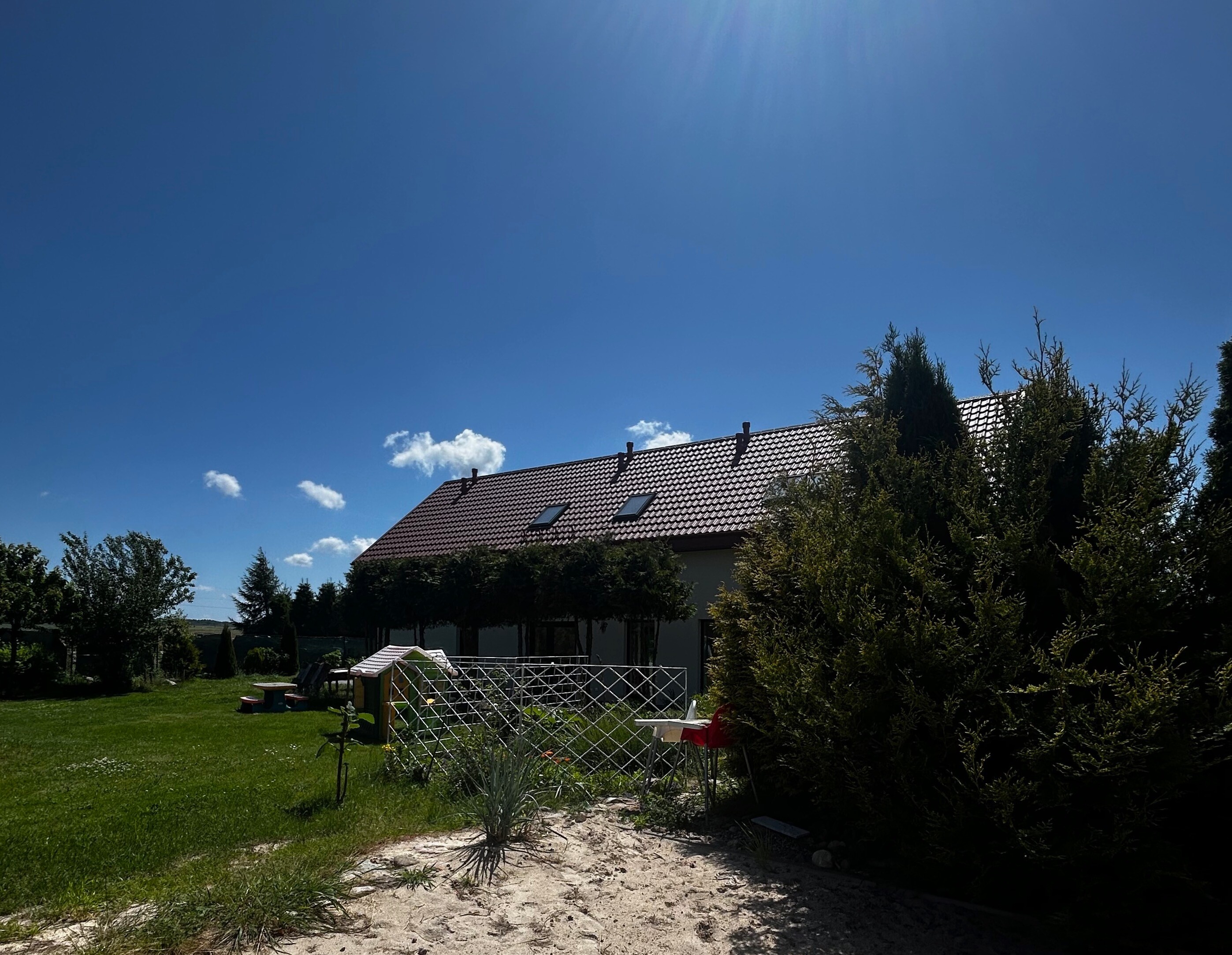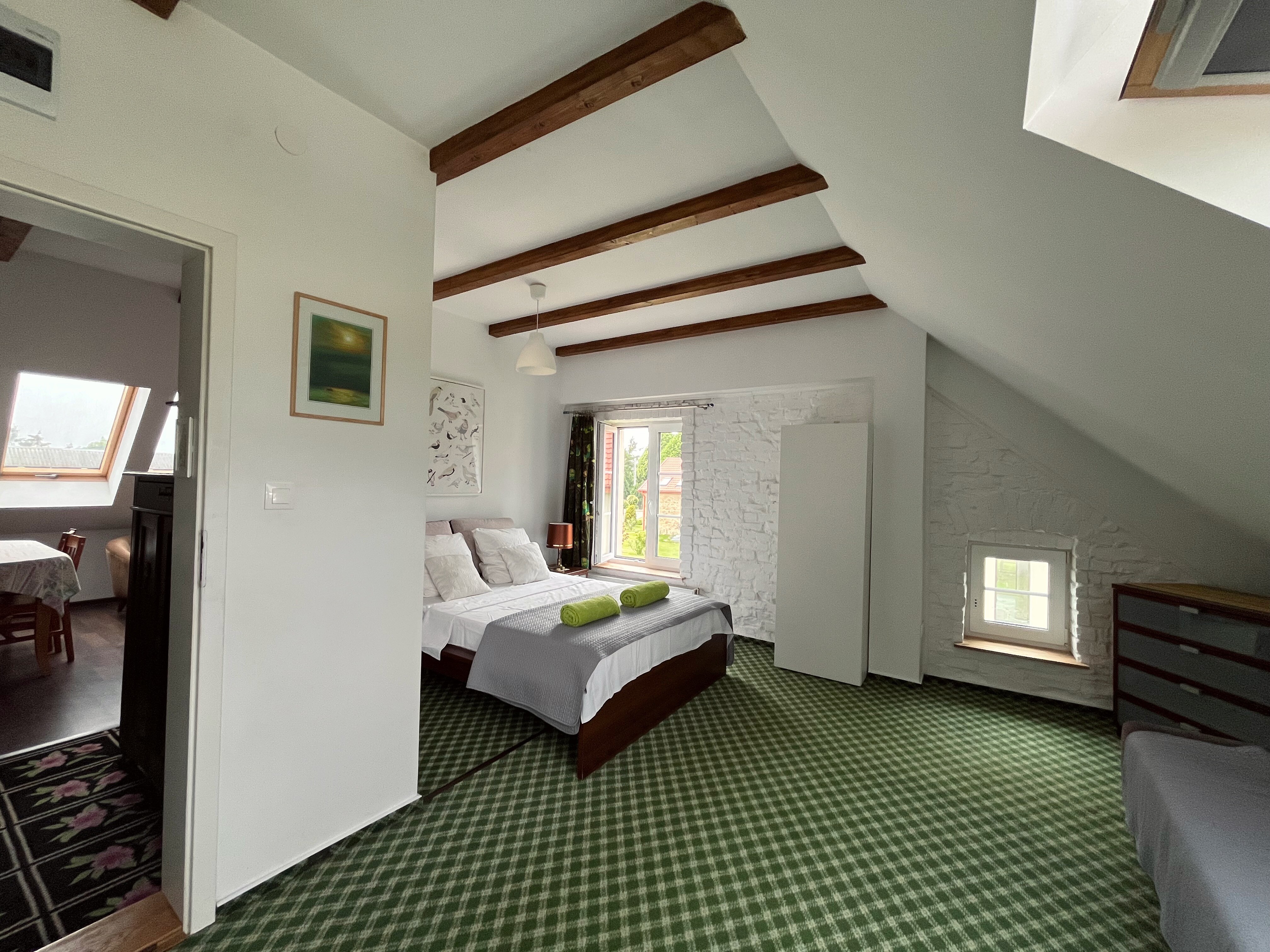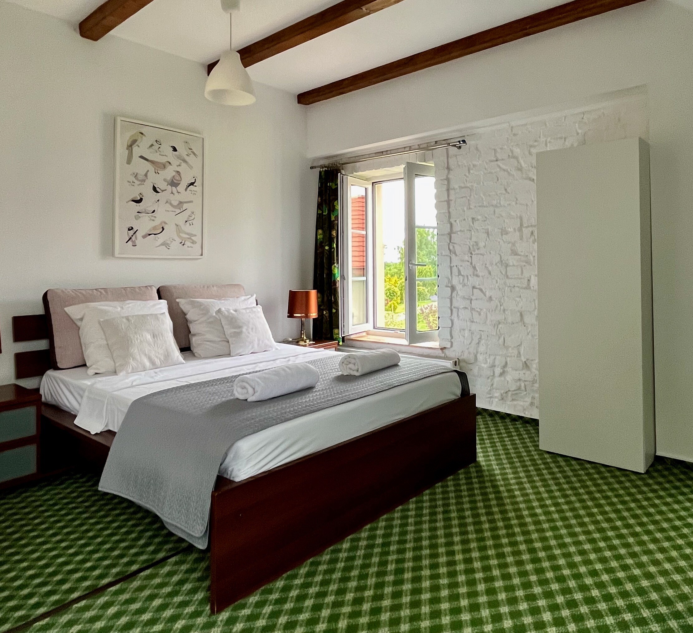 Przytulny i jasny, utrzymany w naturalnych tonach apartament dla czterech osób. Składa się z dwóch osobnych pokoi, nowoczesnej łazienki oraz prywatnego tarasu z widokiem na kaszubską wieś i bocianie gniazdo.