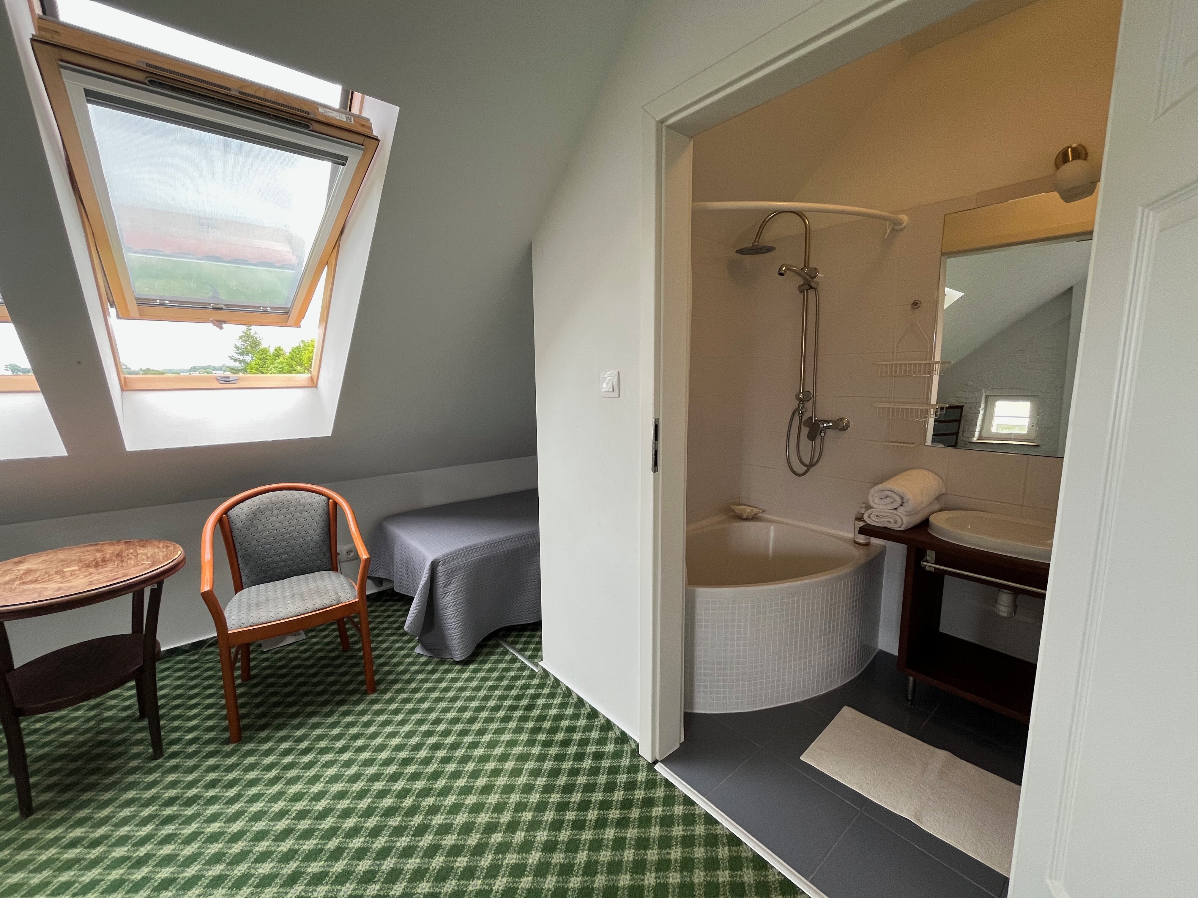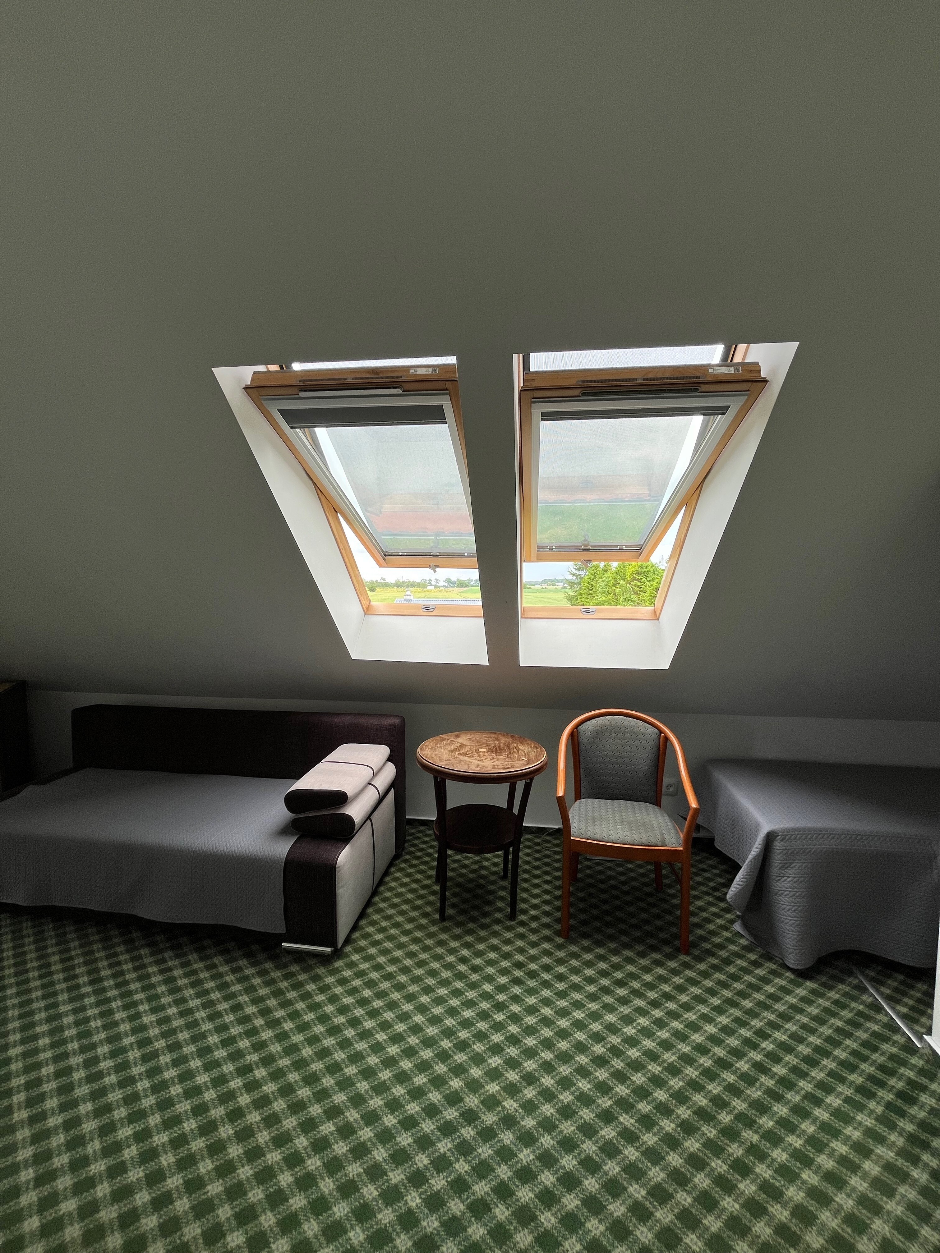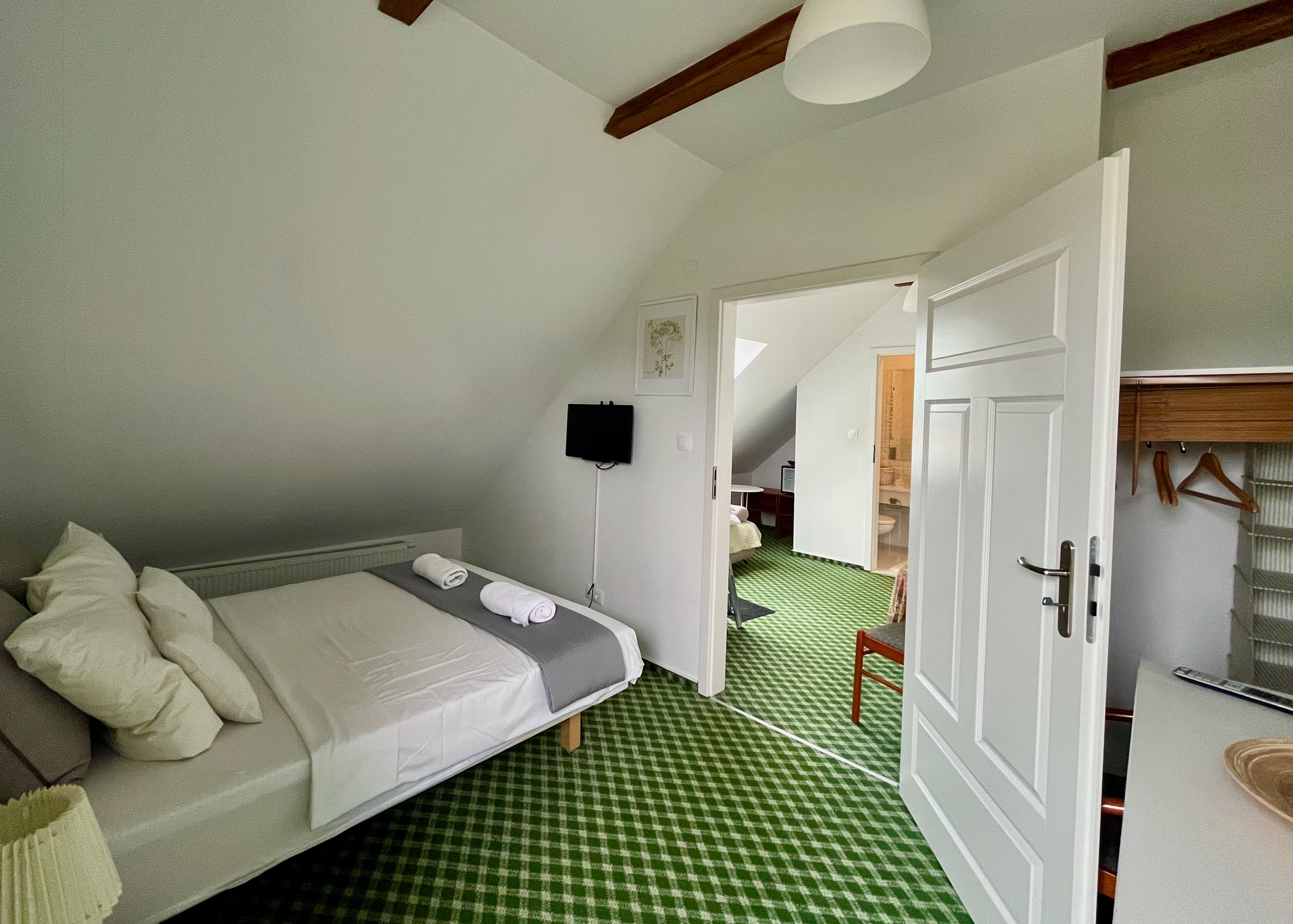 Przestronny i klimatyczny pokój dla czterech osób na piętrze z widokiem na serce siedliska oraz rozległe pola i łąki kaszubskie, które koją wzrok i duszę o każdej porze dnia. Jasne wnętrze w naturalnych tonacjach, z dużym łożem małżeńskim (160 cm), dodatkowym łóżkiem pojedynczym (90 cm) i wygodną, rozkładaną sofą, zaprasza do odpoczynku. Nowoczesna łazienka z wanną i prysznicem pozwala zanurzyć się w błogim relaksie po dniu w naturze. Do dyspozycji gości: pojemna szafa, komoda, stolik z krzesłami – wszystko, czego potrzeba, by poczuć się jak u siebie.