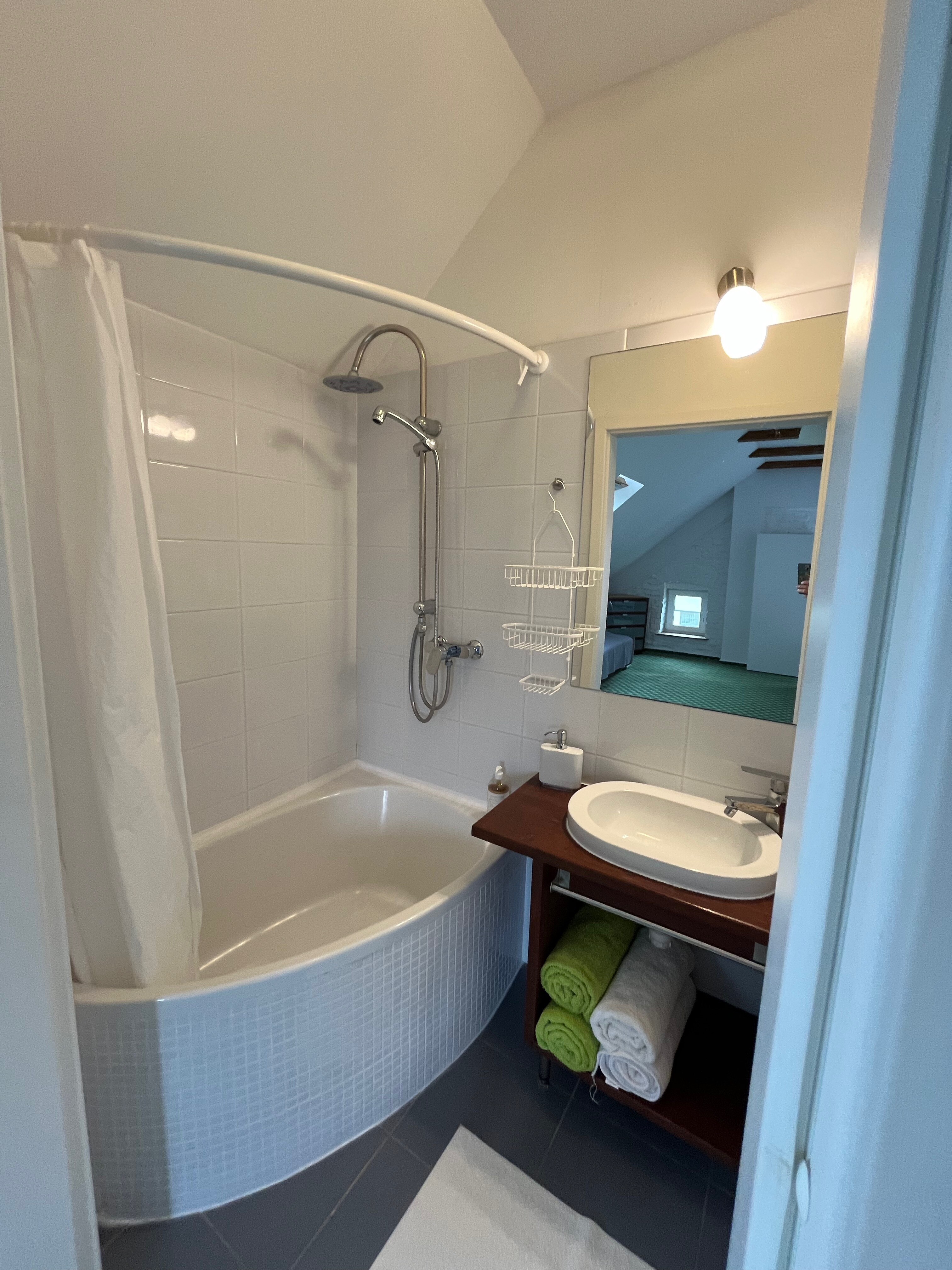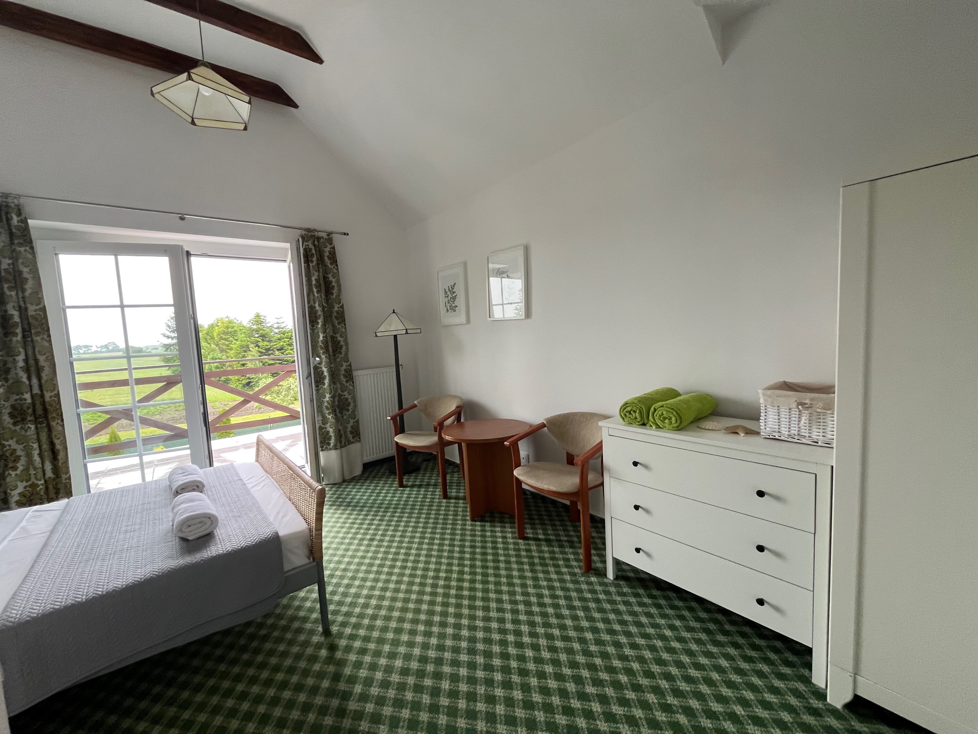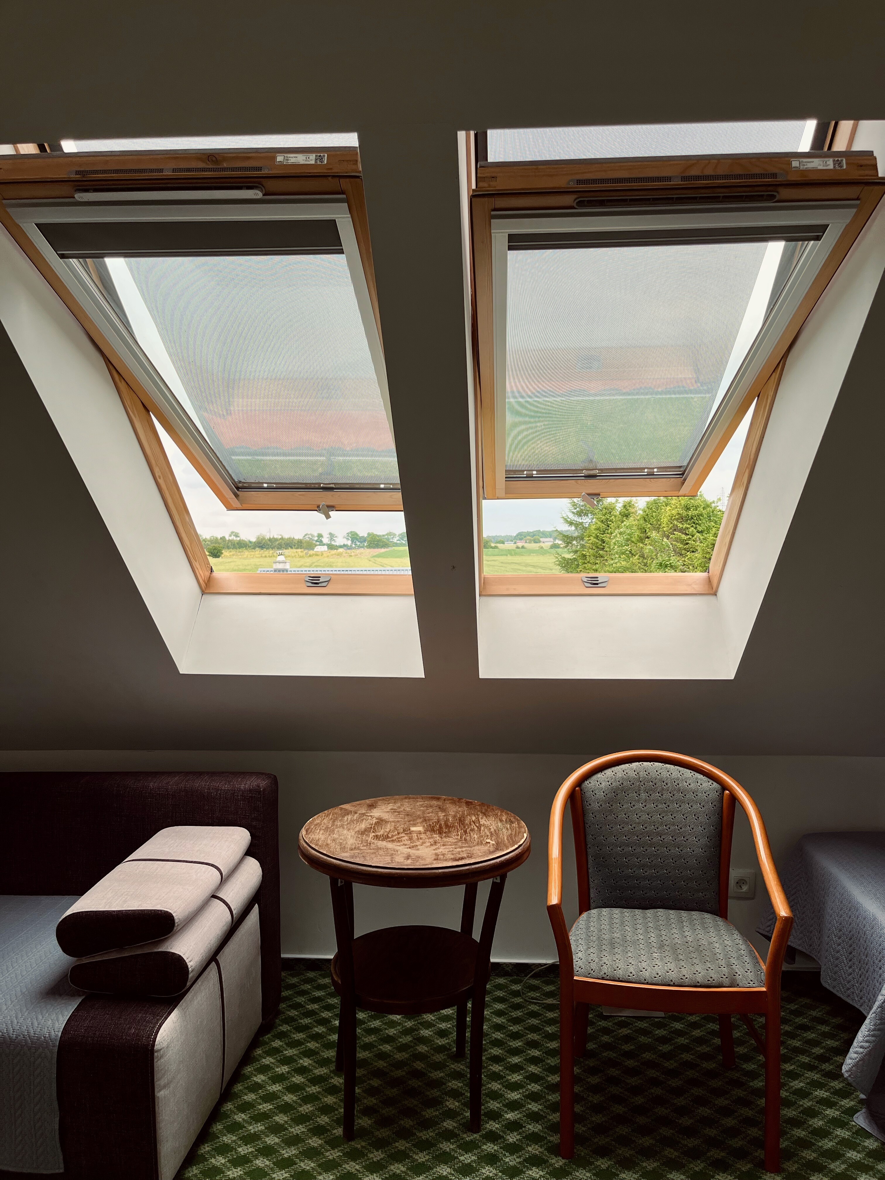 Przestronny i klimatyczny pokój dla czterech osób na piętrze z widokiem na serce siedliska oraz rozległe pola i łąki kaszubskie, które koją wzrok i duszę o każdej porze dnia. Jasne wnętrze w naturalnych tonacjach, z dużym łożem małżeńskim (160 cm), dodatkowym łóżkiem pojedynczym (90 cm) i wygodną, rozkładaną sofą, zaprasza do odpoczynku. Nowoczesna łazienka z wanną i prysznicem pozwala zanurzyć się w błogim relaksie po dniu w naturze. Do dyspozycji gości: pojemna szafa, komoda, stolik z krzesłami – wszystko, czego potrzeba, by poczuć się jak u siebie.
