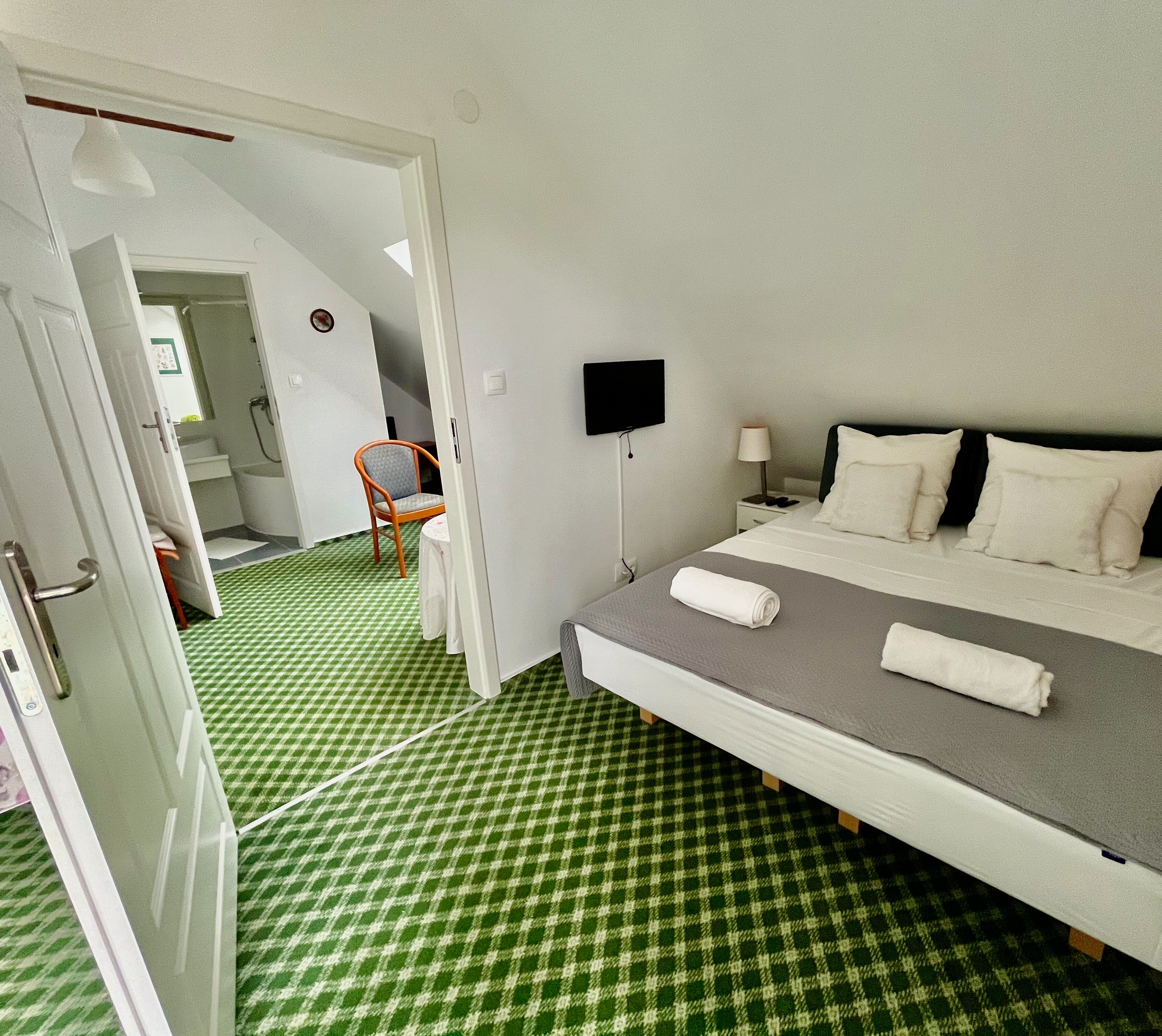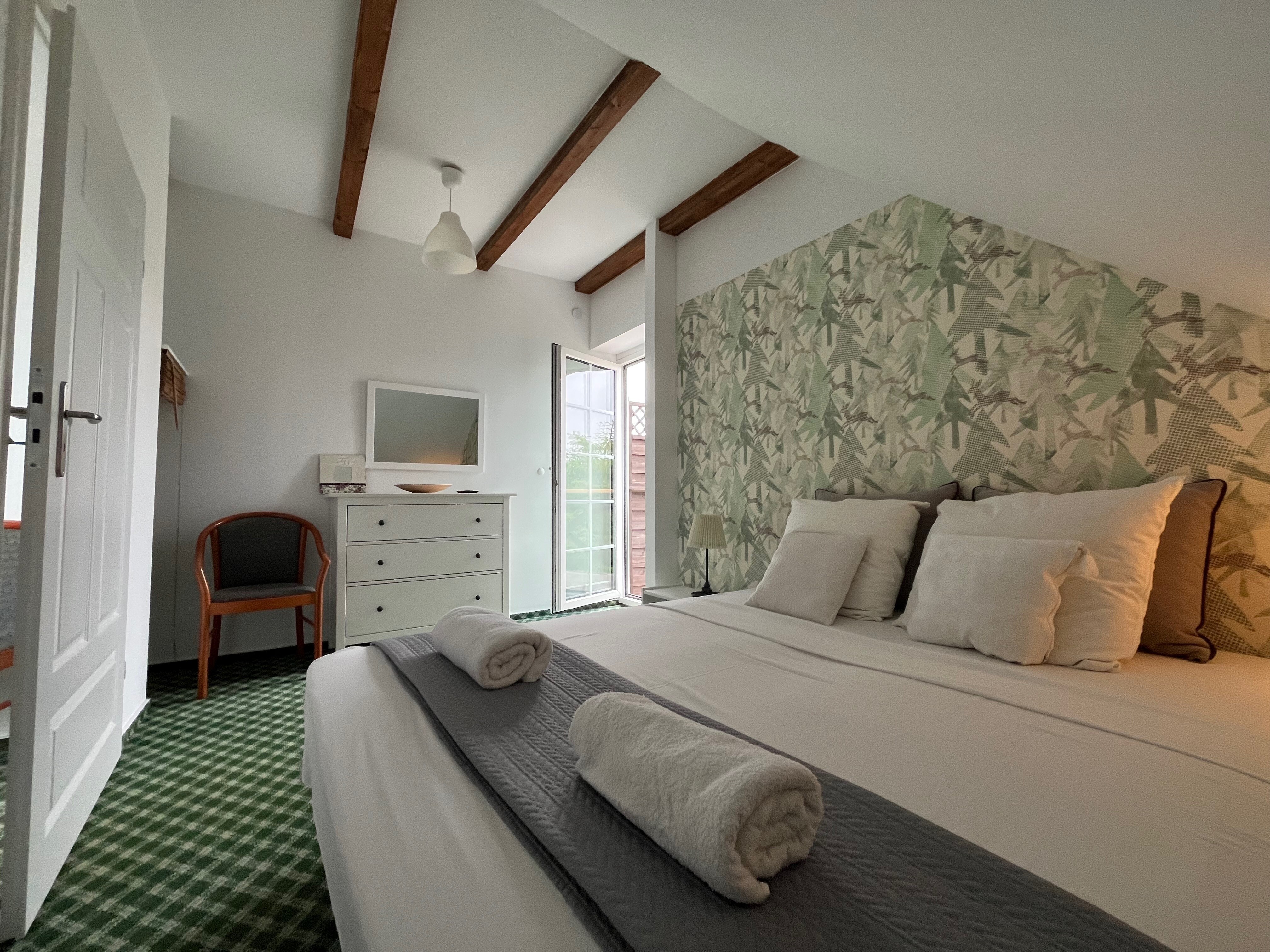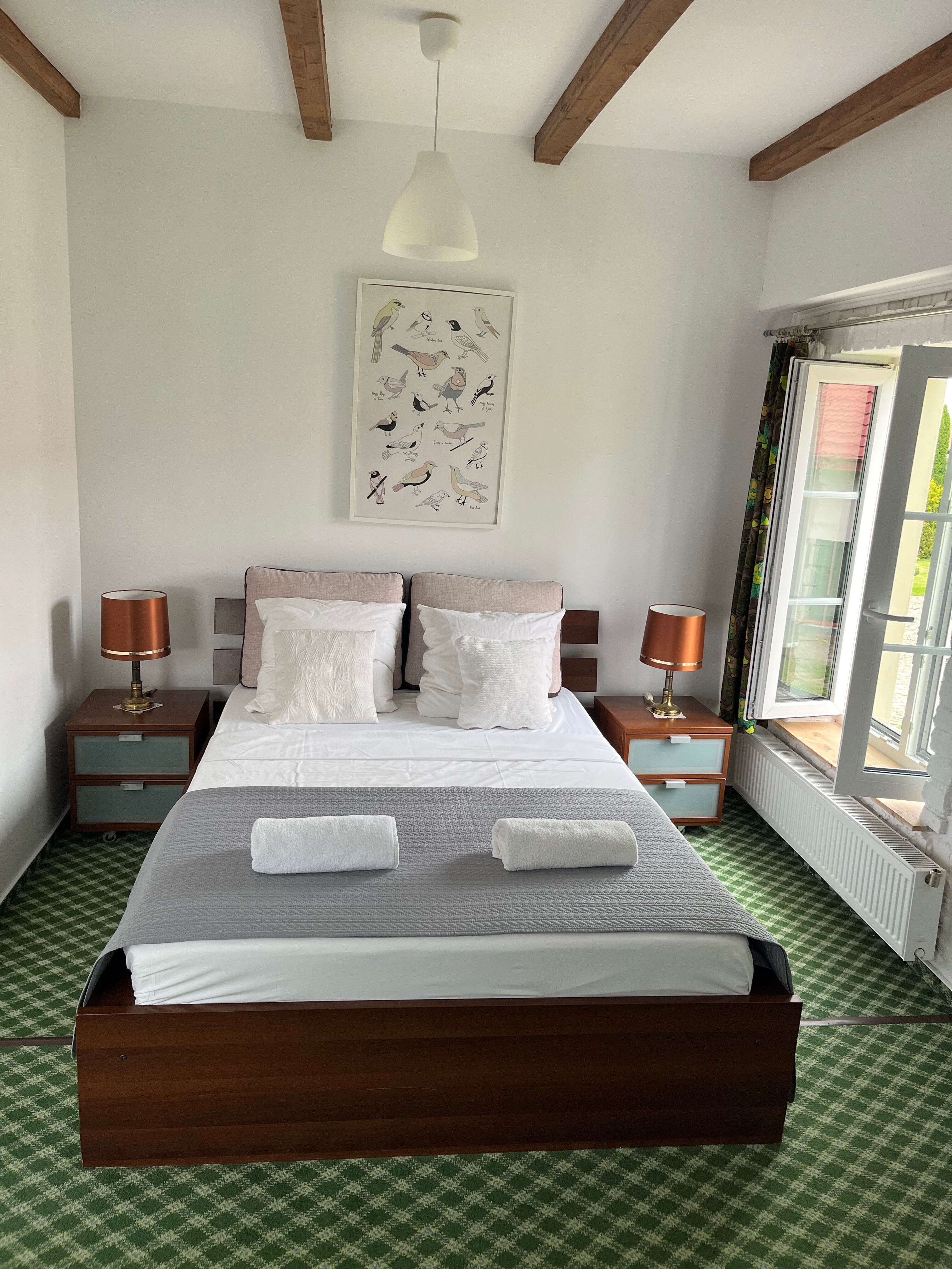 Przestronny, dwuosobowy pokój utrzymany w kojących, naturalnych tonacjach. Wyposażony w wygodne łóżko, przestronną szafę na ubrania oraz prywatną łazienkę z prysznicem. Goście mają do dyspozycji bezpłatne Wi-Fi, które umożliwia wygodną pracę zdalną lub relaks przy ulubionym serialu.