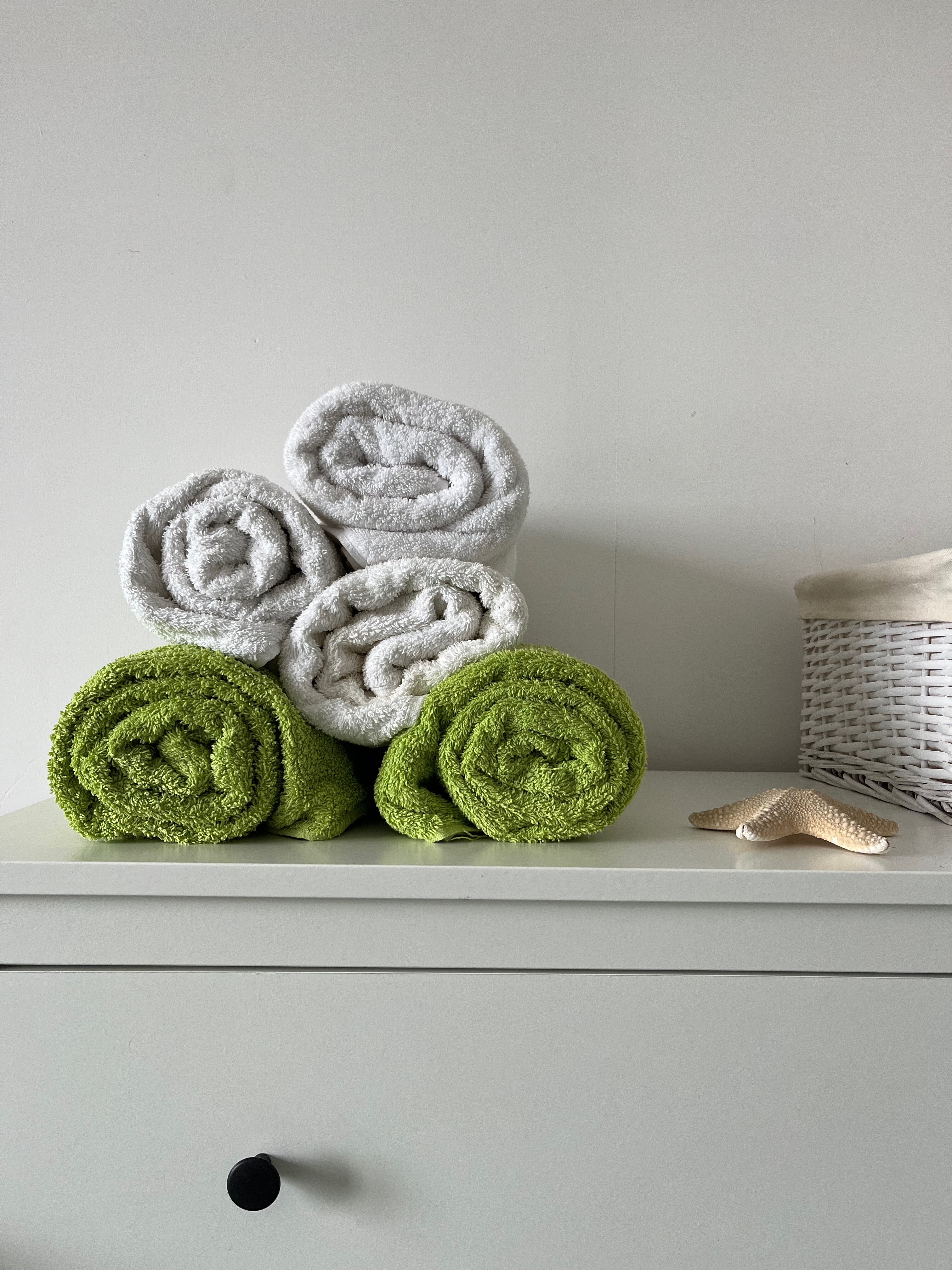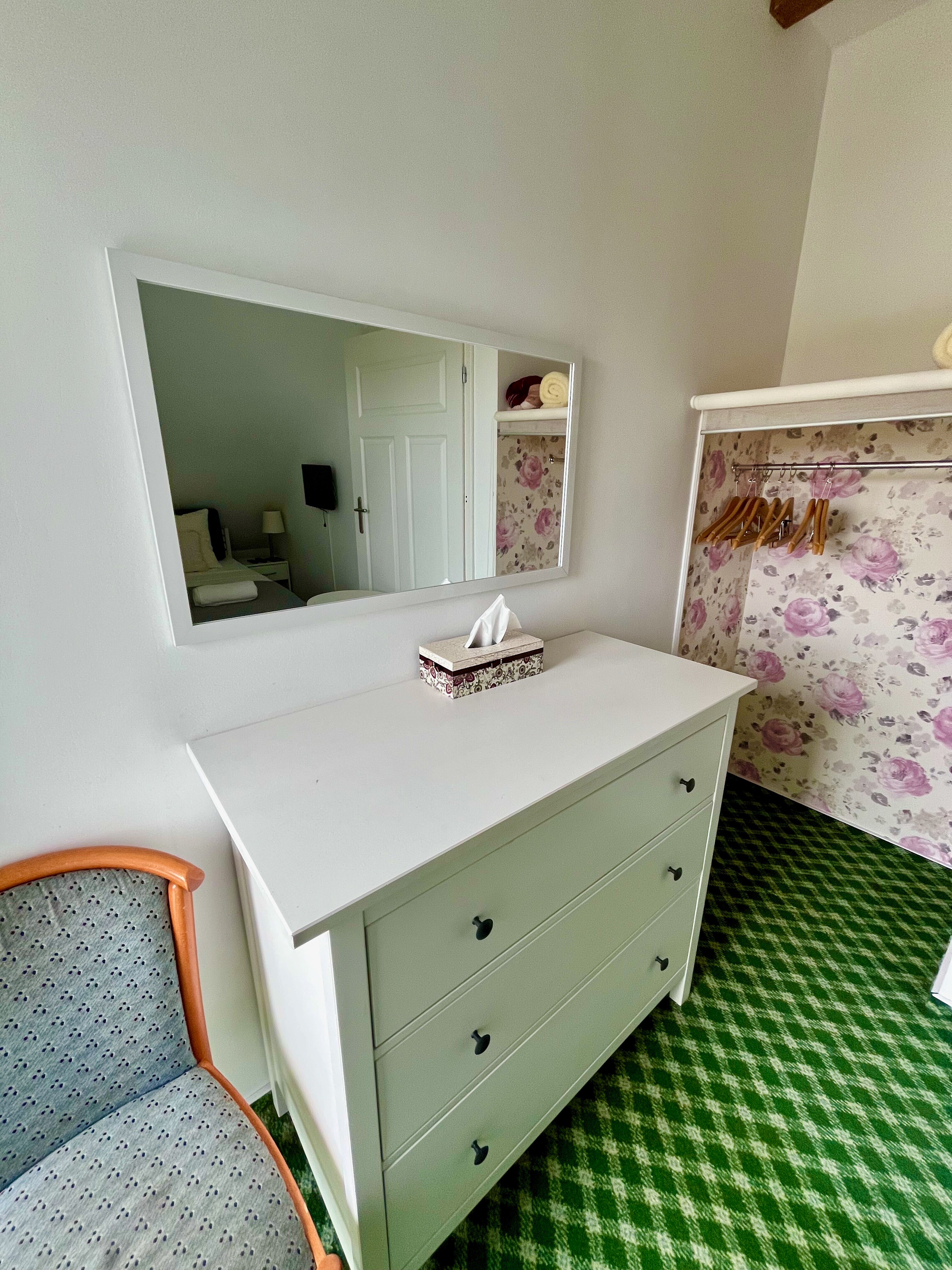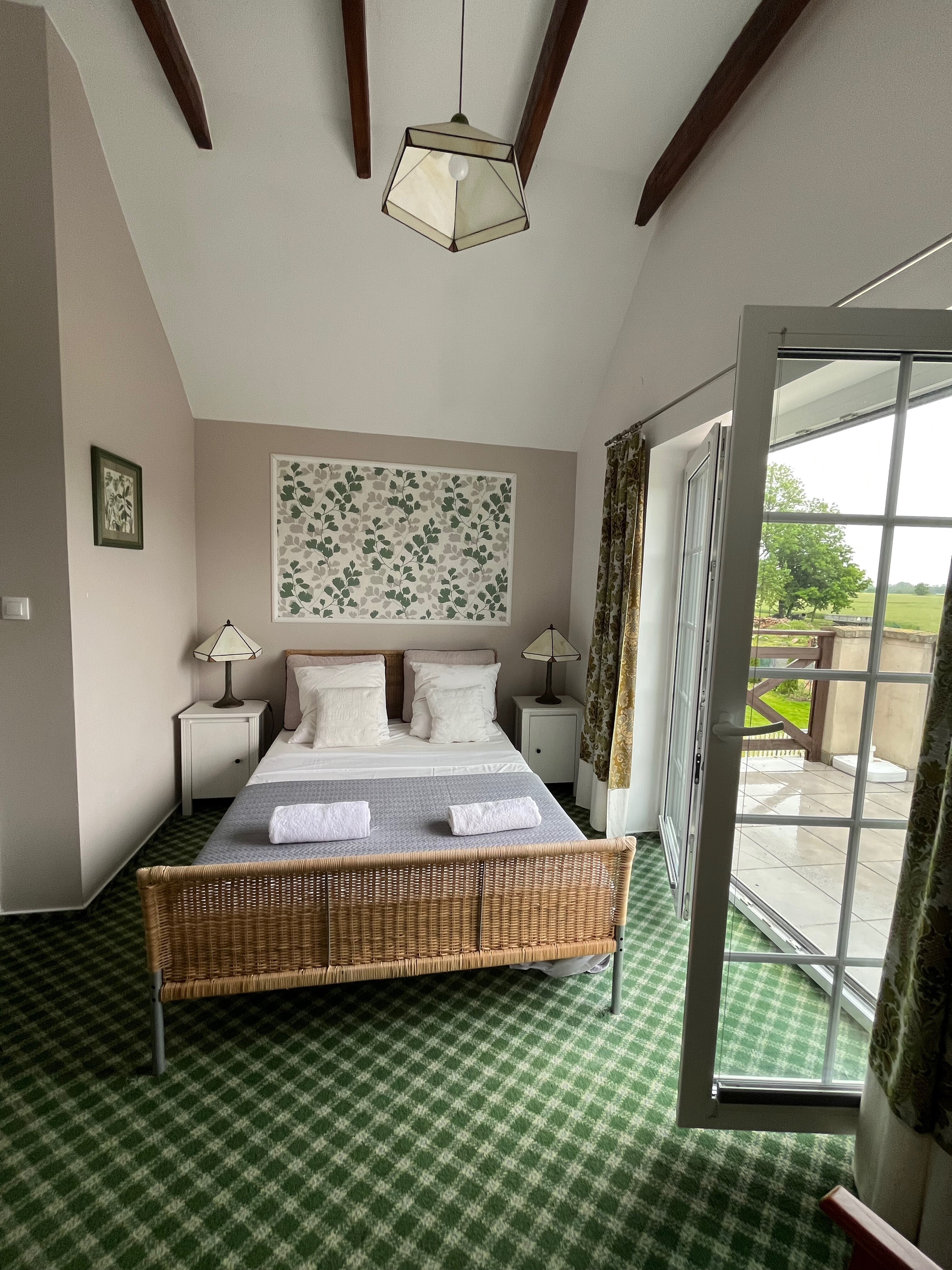 Jednym z największych atutów pokoju jest duży, prywatny taras z leżakami i pięknym widokiem na rozciągające się pola. To idealna przestrzeń na poranną kawę, popołudniowy relaks z książką lub romantyczny wieczór przy zachodzie słońca. Pokój Miętowy to idealny wybór na spokojny wypoczynek wśród przyrody, z dala od zgiełku miasta.
