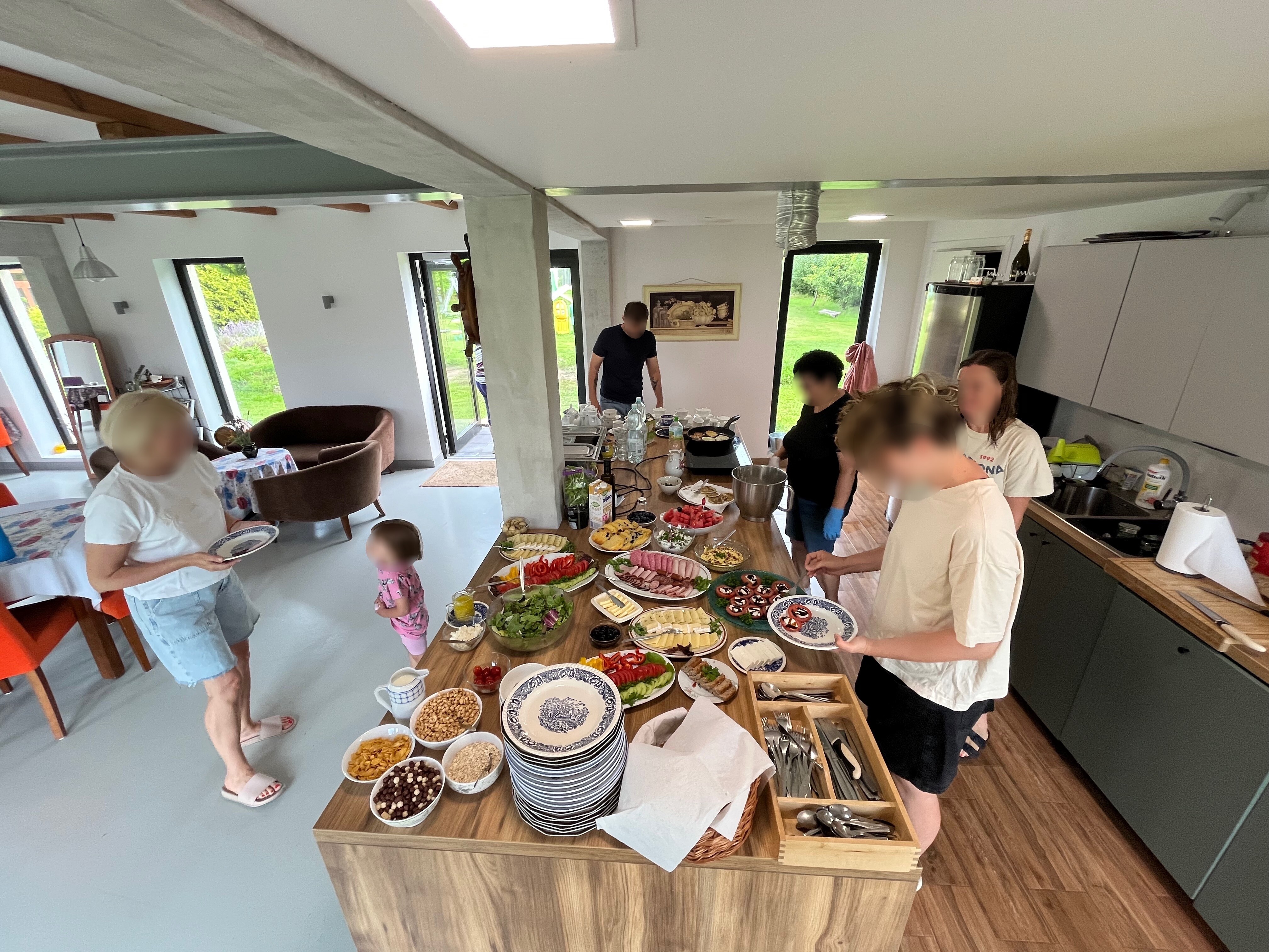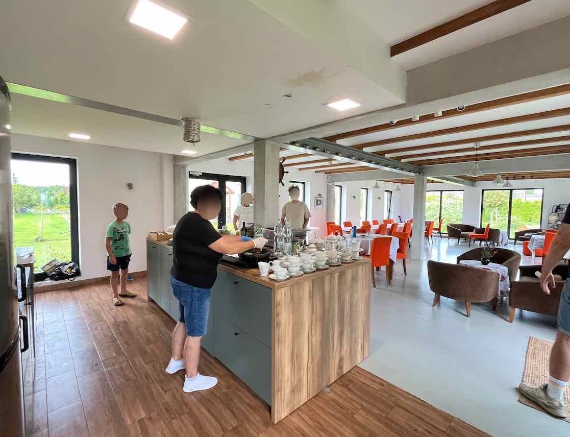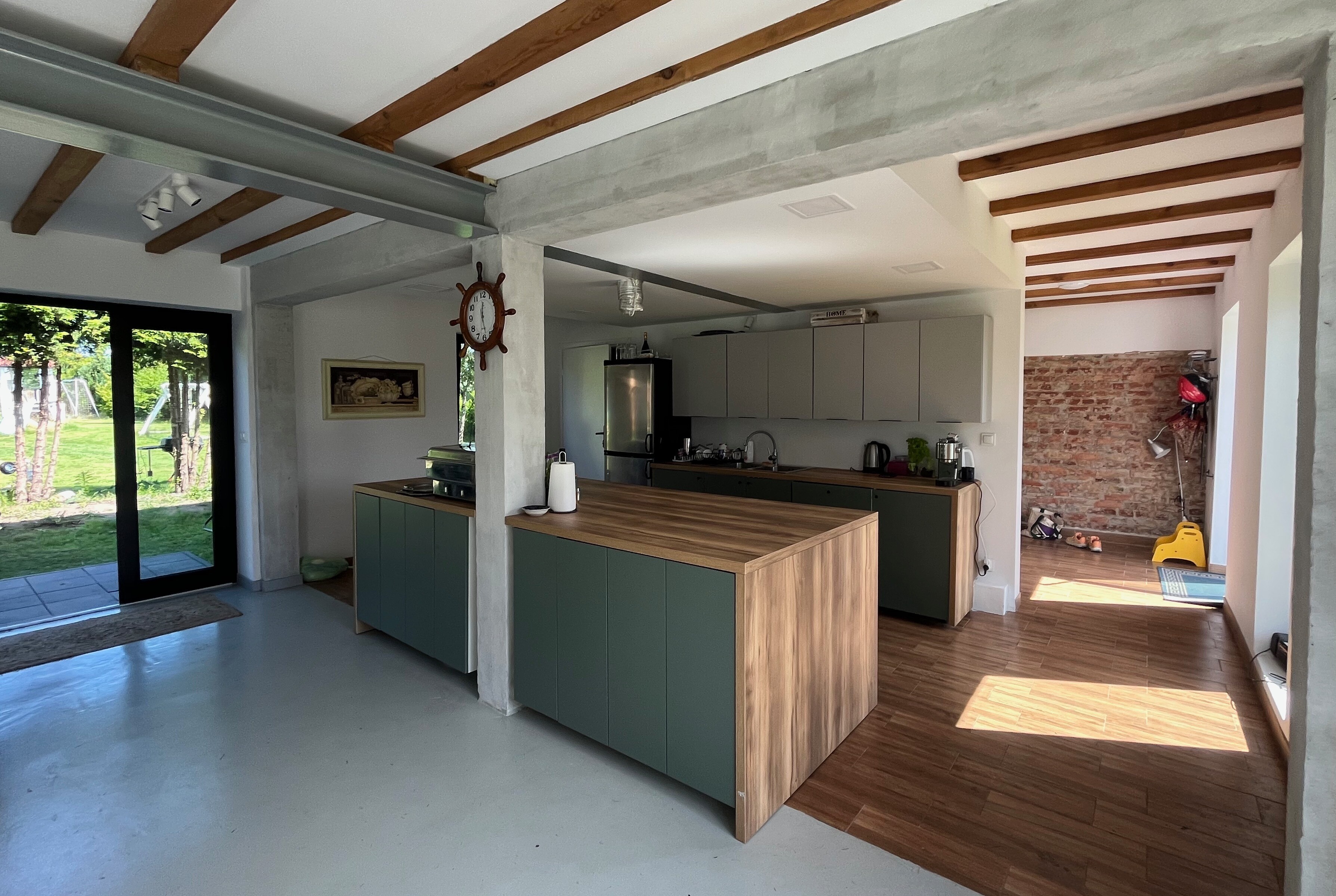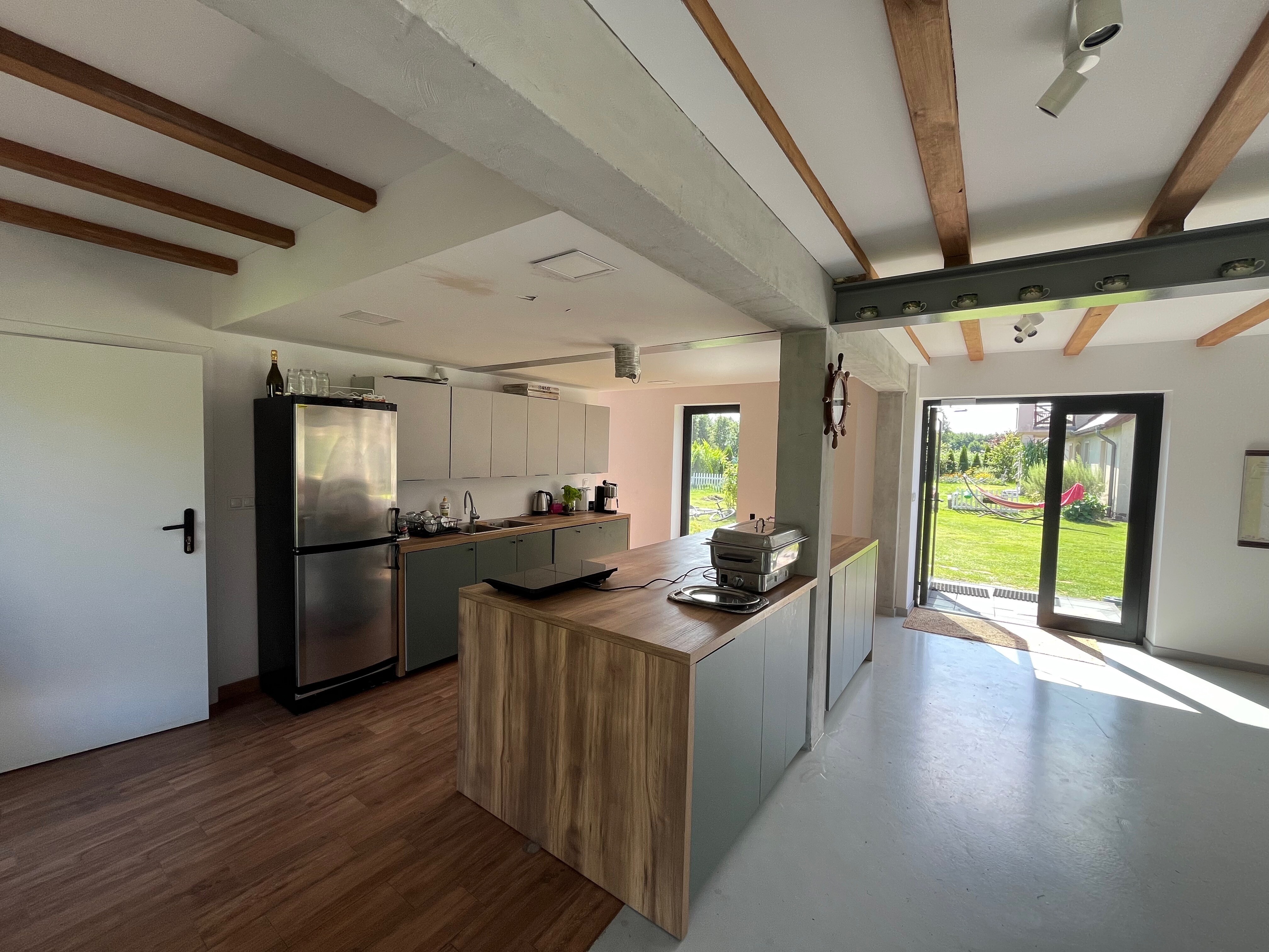 Wnętrze doświetlają duże okna sięgające ziemi, które otwierają przestrzeń na ogród i naturalne otoczenie siedliska. W szczycie pomieszczenia znajduje się otwarta, nowoczesna kuchnia z dużą wyspą roboczą, która sprzyja gotowaniu wspólnemu i indywidualnemu – wygodna, funkcjonalna i gotowa na pracę z grupą.